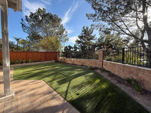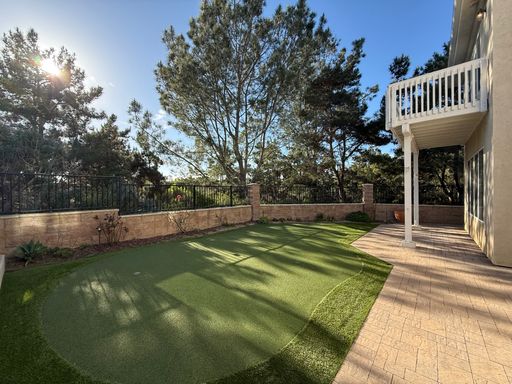 -Large backyard with covered patio and putting green