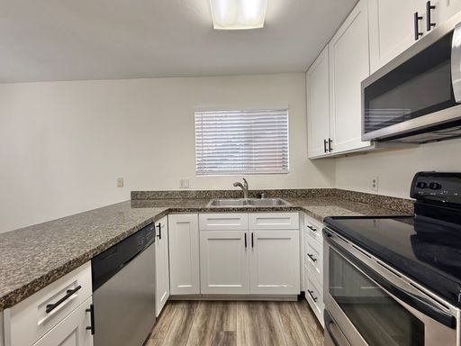 The thoughtfully designed kitchen showcases granite countertops, stainless steel appliances, and abundant cabinet storage—perfect for cooking and entertaining. Both bathrooms have been tastefully updated with granite, tile, and laminate flooring, while the spacious bedrooms feature plush, neutral carpeting for added comfort.