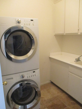 The laundry room boasts a full-size front-loading washer and dryer, linen cabinets, and a soak sink. The two-vehicle garage offers plenty of upper shelving.